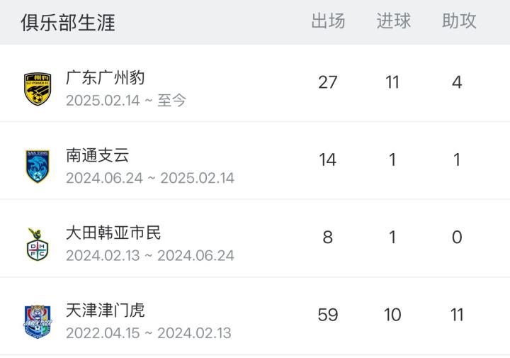 到了2025赛季,罗萨已经代表广东广州豹踢了27场,进了11个球,还助攻了4次。